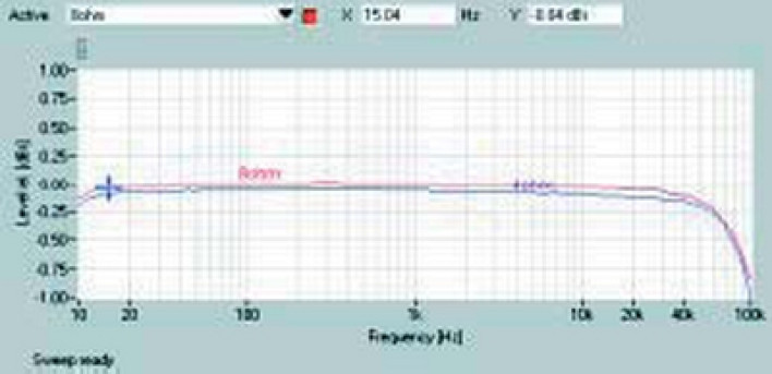 Poziom szumów jest najniższy w tym teście - stąd wypada pochwalić S/N równy 89dB, a także dynamikę 112dB. Pasmo przenoszenia Yamahy (rys.1) jest wyborne, przy 10Hz spadek wynosi tylko 0.1dB, a dla 100kHz -0.8dB.