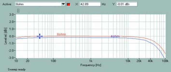 Pasmo przenoszenia (rys.1) biegnie liniowo od granicy 10Hz, mają spadek nie większy niż -3dB przy 100kHz.