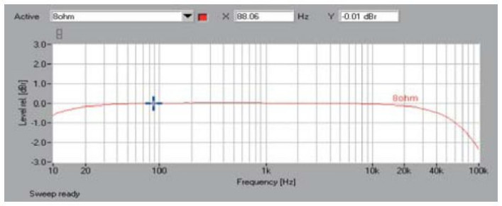 Marantz atakuje wysoką mocą wyjściową, każdy z kanałów może wygenerować aż 145 W mocy, oczywiście nie wszystkie na raz, jednak wydajność zasilacza i tak jest imponująca. W stereo mamy 2 x 135 W, nie każdy wzmacniacz zintegrowany w cenie SR5003 może się pochwalić takim potencjałem, w trybie pięciokanałowym urządzenie pokonuje całą konkurencję, dostarczając aż 5 x 80 W. W gąszczu układów ciężko było wyeliminować szum, ale S/N na poziomie 81 dB to całkiem nieźle, dynamika sięga 103 dB. Pasmo przenoszenia (rys.1) pokrywa zakres 10 Hz do 100 kHz ze spadkami odpowiednio -0,6 dB oraz -2,3 dB. Spektrum z rys.2 prezentuje niewielki udział zniekształceń harmonicznych, ograniczają się one praktycznie do drugiej, trzeciej i piątej o poziomach odpowiednio -85 db i -86 dB oraz -87 dB. Kolejne nieparzyste leżą już znacznie poniżej -90 dB. Niskie zniekształcenia (THD+N < 0,1%) można prześledzić na rys.3, z którego odczytamy odpowiadające im przedziały mocy, od 0,8 W do 129 W.