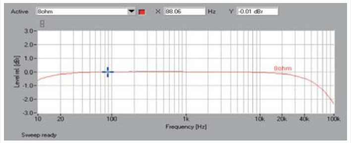 Pasmo przenoszenia (rys.1) pokrywa zakres 10 Hz do 100 kHz ze spadkami odpowiednio -0,6 dB oraz -2,3 dB. Spektrum z rys.2 prezentuje niewielki udział zniekształceń harmonicznych, ograniczają się one praktycznie do drugiej, trzeciej i piątej o poziomach odpowiednio -85 db i -86 dB oraz -87 dB. Kolejne nieparzyste leżą już znacznie poniżej -90 dB. Niskie zniekształcenia (THD+N < 0,1%) można prześledzić na rys.3, z którego odczytamy odpowiadające im przedziały mocy, od 0,8 W do 129 W.