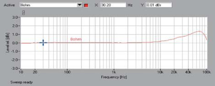 Poziom szumów to zwykle pięta achillesowa wzmacniacza cyfrowego, i tym razem nie wypada on doskonale; 80 dB to jednak w kategorii amplitunerów wynik wcale nie najgorszy, dynamika wynosi 102 dB. Pasmo przenoszenia (rys. 1) ujawnia typowe zachowanie wzmacniacza impulsowego, podbicie w zakresie wysokich częstotliwości (szczyt +1,3 dB) jest efektem ubocznym działania filtrów na wyjściu. Spadek przy 10 Hz to śladowe -0,05 dB.
