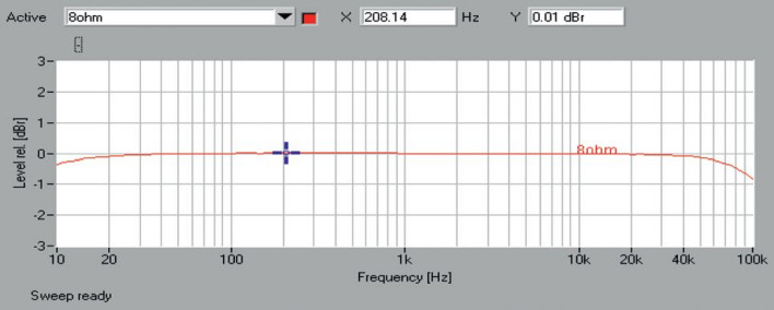 Trudno napisać cokolwiek krytycznego o pasmie przenoszenia (rys.1), zarówno przy 10 Hz (-0,3 dB), jak i 100 kHz (-0,8 dB) spadki są minimalne. W spektrum zniekształceń (rys. 2) najsilniejsze są druga i trzecia harmoniczna (-80 dB), kolejne nieparzyste widoczne są już poniżej granicy -90 dB.