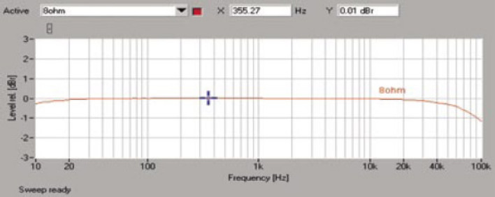 Poziom szumów jest niezły (czyli niski) na tle innych amplitunerów, bo wynosi -86 dB, dynamika sięga 106 dB. Pomiar pasma przenoszenia (rys. 1.) daje rewelacyjne wyniki, przy 10 Hz notujemy śladowy spadek (-0,3 dB), a przy 100 kHz zaledwie -1,2 dB. Poziom zniekształceń (rys. 2.) ujawnia drugą oraz piątą harmoniczną jako najsilniejsze w widmie, leżą odpowiednio przy -84 dB oraz -86 dB, kilka pozostałych, choć widocznych, nie przekracza już granicy -90 dB. Wykres z rys. 3. prezentuje się typowo, jak przystało na wzmacniacz tranzystorowy z wyraźnie zarysowanym przesterowaniem i poprzedzającym go minimum zniekształceń. Poziom THD+N poniżej 0,1 % można obserwować już od "wczesnych" 0,8 W.
