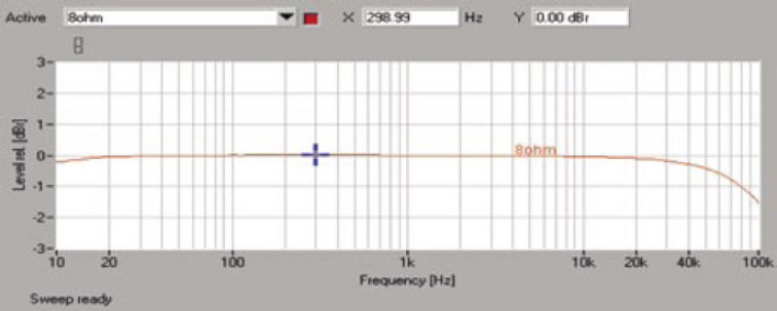 Jak widać, moce podawane przez producentów amplitunerów są tylko orientacyjne - możliwości pojedynczej końcówki są zwykle wyższe, ale przy obciążeniu wszystkich nie można wyciągnąć z nich pełnego potencjału ani mocy "katalogowej" - obsługuje je wspólny zasilacz i on ogranicza moc całkowitą. Poziom szumów nie jest rekordowo niski (-79 dB), wysoka moc zdołała jednak dźwignąć dynamikę nieco powyżej 100 dB. Pasmo przenoszenia (rys. 1.) wygląda ładnie, ze spadkiem tylko -1,5 dB przy 100 kHz. Na rys. 2. nie widać najdrobniejszych problemów, najsilniejsza jest trzecia harmoniczna, której poziom to jednak bardzo niskie -92 dB, o kolejne kilka decybeli niżej leży piąta. Niskie zniekształcenia pomagają (rys. 3.), THD+N jest niższe od 0,1 % już dla mocy przewyższających 1 W, i taki stan utrzymuje się do przesterowania.