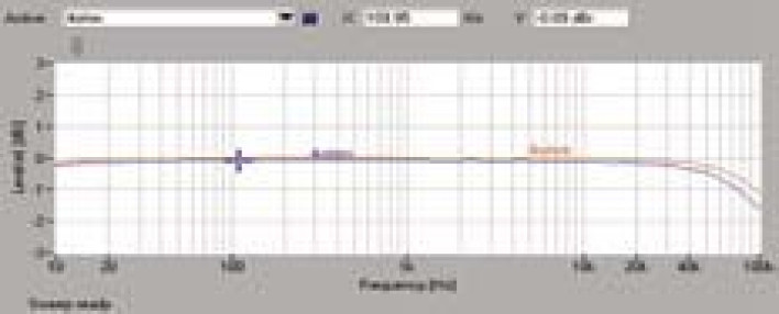 Na rys.1. odczytamy dwie podobne charakterystyki, dla 8 i 4 omów, przy 100 kHz poziom nie spada poniżej -1,6 dB, natomiast przy 10 Hz trzyma się blisko referencyjnej linii 0 dB.