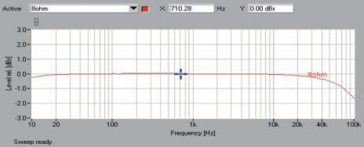 Poziom szumów wynosi -83 dB, ale ogromna moc winduje dynamikę na 105 dB. Pasmo przenoszenia (rys.1.) w zakresie niskotonowym spisuje się idealnie (-0,2 dB przy 10 Hz), a przy 100 kHz też dobrze (-1,7 dB). Spektrum zniekształceń (rys. 2.) właściwie nie wymaga komentarza, jest niemal wzorowo czyste, jedynie z bardzo subtelnie (-90 dB) zaznaczoną trzecią harmoniczną. Wykres z rys. 3. to typowy przebieg dla urządzenia tranzystorowego z wyraźnie malejącymi zniekształceniami, powyżej 2 watów THD+N jest niższe od 0,1 %.