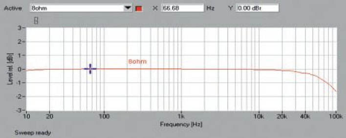 Czułość jest typowa (0,18 V), a poziom szumów -84 dB nie rozczarowuje, choć bywało lepiej. Wysoka moc wyjściowa zapewnia dynamikę sięgającą 105 dB. Pasmo przenoszenia (rys.1) sięga do 100 kHz ze spadkiem -1,6 dB, a przy 10 Hz prezentuje niemal wzorcową liniowość. W spektrum zniekształceń (rys. 2) nie dzieje się nic niepokojącego, najsilniejszą harmoniczną jest druga z umiarkowanym poziomem -84 dB.