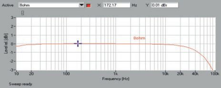 Pasmo przenoszenia (rys.1) prezentuje się bardzo dobrze, spadek -6 dB mamy przy 90 kHz. Trzecia harmoniczna (-80 dB) oraz leżąca o 5 dB niżej druga to jedyne zniekształcenia, jakie w spektrum (rys. 2) mocniej zaznaczają swoją obecność powyżej 90 dB.