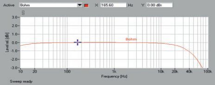 Każda z końcówek dostarcza 78 W, w stereo dostajemy 2 x 75 W, a w trybie pięciokanałowym - 5 x 51 W. Stosunek sygnał/szum ma wartość przeciętną dla amplitunerów AV - 83 dB - a dynamika osiąga 102 dB. Chociaż w pasmie przenoszenia (rys.1) widać spadek rozpoczynający się już od 20 kHz, to jednak punkt -3 dB przypada na dość wysokie 79 kHz.