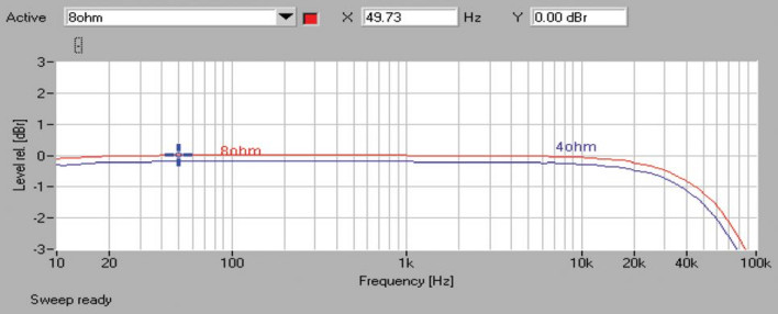 Odstęp od szumów jest przyzwoity, S/N wynosi 84 dB, a dynamika, głównie dzięki wysokiej mocy, sięga 106 dB. Pasmo przenoszenia (rys.1) nie ujawnia żadnych problemów przy 10 Hz, od strony wysokich częstotliwości jest również dobrze, spadki -3 dB wyznaczymy dopiero dla 90 kHz przy 8 omach i 80 kHz dla 4 omów.