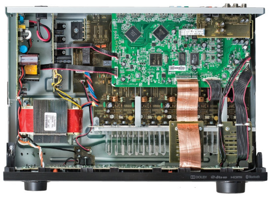 Wnętrze Denona AVR-X520BT cieszy oko. Duży, choć nie toroidalny, transformator oraz pozostałe układy zasilacza zostały ulokowane z jednej strony obudowy. Dolną część chassis zajmuje wzmacniacz zbudowany z tradycyjnych tranzystorów przytwierdzonych do aluminiowego radiatora. Uwagę zwraca bardzo duża płytka zawierająca układy cyfrowe (m.in. Analog Devices, ARM, ESMD, Panasonic), a także staranne zaprojektowanie i wykonanie całości.