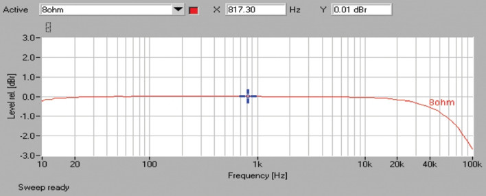 Bardzo dobrze wygląda pasmo przenoszenia (rys.1) z idealnym wręcz zachowaniem w okolicach 10 Hz i niezbyt dużym spadkiem, ok. -2,5 dB, przy 100 kHz.