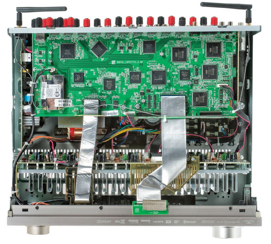 Typowa "piętrowa" konstrukcja amplitunera AV. Tranzystory kanałów mocy znalazły się w komplecie na jednym dużym radiatorze zamocowanym wzdłuż przedniego panelu.