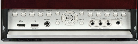 Można szybko wybrać źródło, strefę i wykonać ustawienia w menu. Umieszczone tu gniazda obejmują USB, HDMI, wyjście słuchawkowe i analogowe wejście AV; w tym miejscu podłącza się także mikrofon systemu automatycznej kalibracji Audyssey.