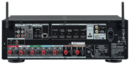 AVR-X1300W nie ma konwertera wizyjnego ani skalera. Wejścia audio są cztery - dwa cyfrowe (światłowodowe) i dwa analogowe (RCA). Wyjścia nie ma żadnego, jeśli nie liczyć pary RCA dla dwóch aktywnych subwooferów. Nie ma też wejścia na zewnętrzny dekoder ani wyjść na dodatkowe wzmacniacze mocy, ale to zupełnie normalne w tej klasie amplitunerów AV.