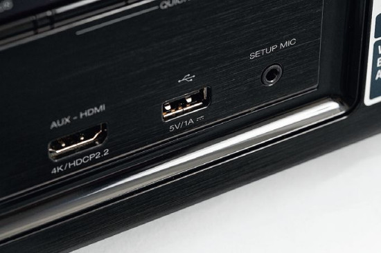 Podręczne wejście HDMI obsługuje 4K, podobnie jak wszystkie złącza tego typu na tylnym panelu. USB służy nie tylko do odczytywania plików z pendrajwów i twardych dysków, ale pozwala także na odtwarzanie danych z przenośnych urządzeń Apple.