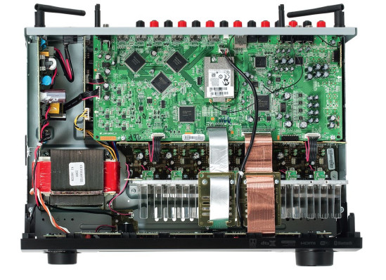 Denon (i nie tylko on) upodobał sobie tranzystory wyjściowe Sankena; każdy z kanałów obsługuje jedna para 2SB1560/2SD2390. Tylną część obudowy zajmuje duża płytka cyfrowa; centrum dekodowania dźwięku tworzy nowoczesny scalak Cirrus Logic CS49844 odpowiedzialny za wszystkie formaty wielokanałowe.
