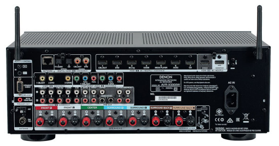 Z tyłu jest siedem wejść HDMI i dwa wyjścia, wszystkie trzymają standardy: HDR, BT.2020, 4:4:4, 60 Hz, HDCP 2.2. Wyjście podstawowe ma ARC, drugie służy do zasilenia sygnałem AV dodatkowej strefy. Znalazło się także miejsce na formaty analogowe (komponent i kompozyt).