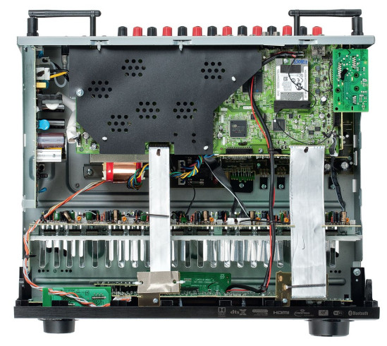 Blok wzmacniaczy wykorzystuje jeden długi radiator, biegnący wzdłuż przedniego panelu. W każdym kanale pracuje jedna para tranzystorów Sankena. Transformator (rdzeniowy) został umieszczony pod płytkami, a elementy prostowników przykręcono do dolnej ścianki, co pomaga odprowadzać ciepło; ta kwestia jest w tym urządzeniu istotna o tyle, że producent pozwala na podłączenie obciążeń 4-omowych we wszystkich kanałach.