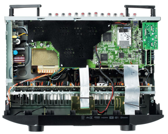 Jednym z elementów wejścia "Online music" jest radio internetowe. Marantz SR5011 jest otwarty na Spotify poprzez protokół Connect. W przedniej części obudowy umieszczono komplet wzmacniaczy (para tranzystorów na kanał), płytkę drukowaną przykręcono do radiatora, w chłodzeniu pomagają liczne otwory wentylacyjne, zarówno na dole, jak i na górze skrzynki. Do chłodzenia prostownika wykorzystano z kolei dolną ściankę.