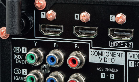 HDCP2.2 jest akceptowane na wejściach HDMI 1-5. Gniazda 6 i 7 (dodatkowo HDMI z przedniego panelu) dysponują delikatnie niższą rozdzielczością, za to nie wymagają porozumiewania się pomiędzy urządzeniami na poziomie HDCP2.2.