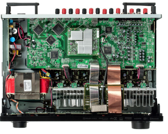Końcówki mocy zbudowano na parach tranzystorów Sankena, umieszczonych w pewnym ścisku na niewielkim radiatorze. Układy wizyjne to komplet scalaków Panasonica, a do obróbki dźwięku służy procesor Cirrus Logic. Gwiazdą sekcji cyfrowej jest ultranowoczesny konwerter DAC - ośmiokanałowy AKM AK4458, zdolny przyjąć nawet sygnały 32 bit/768 kHz i DSD256!