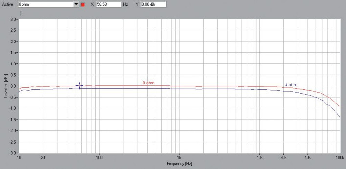 Bardzo ładnie wygląda też rys.1, charakterystyki częstotliwościowe sięgają 100 kHz ze spadkami tylko 1 dB dla 8 Ω i -1,5 dB dla 4 Ω.