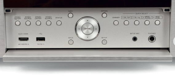 W wejściu podręcznym wciąż mamy HDMI (z 4K oraz HDCP 2.2), złącze USB-A (nośniki pamięci), wyjście słuchawkowe i wejście na mikrofon kalibracyjny; usunięto wejście analogowe.