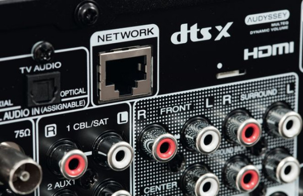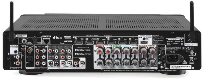 Marantz już od dawna stosuje denonowski system sieciowy HEOS. Jego obecność zwiastuje charakterystyczny układ elementów w górnej części tylnej ścianki. To przede wszystkim dwa gniazda antenowe (powiązane z systemami Wi-Fi oraz Bluetooth) oraz sieciowe złącze przewodowe LAN.