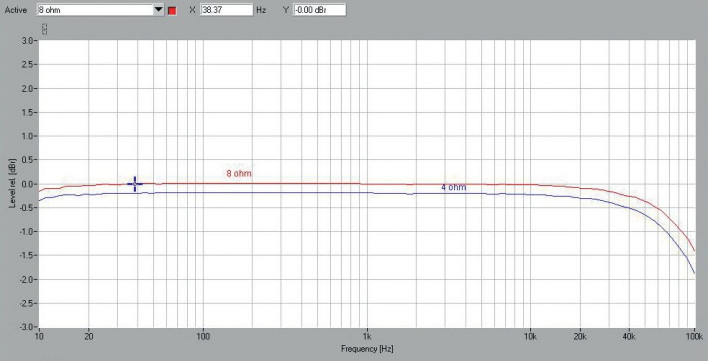 Charakterystyki częstotliwościowe (rys. 1) prezentują się znakomicie. Spadki na skrajach badanego pasma (znacznie szerszego niż pasmo akustyczne) są właściwie nieistotne, przy 10 Hz -0,2 dB, a przy 100 kHz -1,5 dB. Wyglądają dobrze z każdym obciążeniem, wraz z nieco niższym poziomem (w całym zakresie) przy 4 Ω.