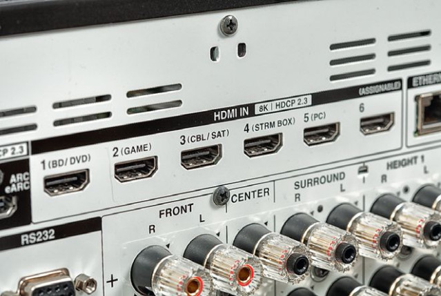 Wejść HDMI jest łącznie siedem (w tym jedno z przodu); trzy pierwsze mają najwyższą przepustowość 40 Gbps, co się przekłada na obsługę sygnałów 8K/60p, trzy kolejne 24 Gbps (8K/24p).
