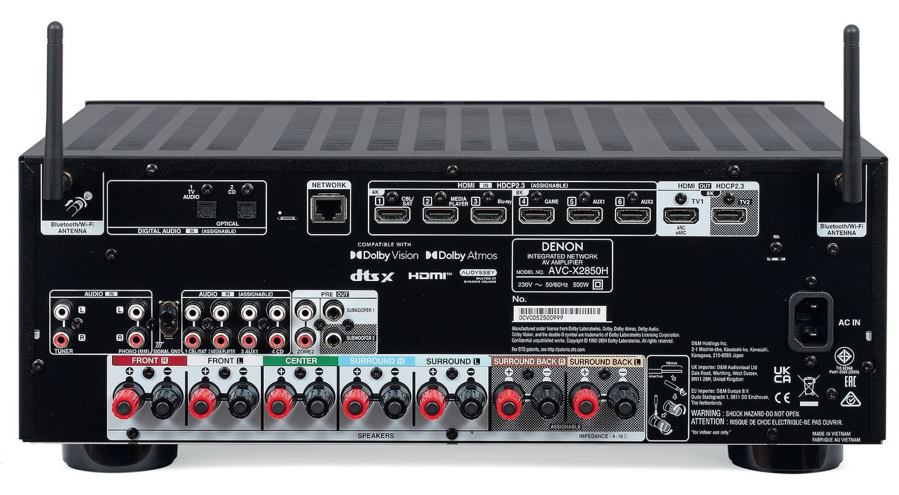 Chociaż Denon AVC-X2850H ma "tylko" siedem końcówek mocy, to radiator jest wyjątkowo duży, zajmuje niemal całą szerokość obudowy. Końcówki są konwencjonalnymi układami w klasie AB (po dwa tranzystory wyjściowe na kanał). Z tyłu obudowy znajduje się zasilanie oraz płytka z elektroniką cyfrową (w tym z procesorami obrazu i sekcją strumieniową).