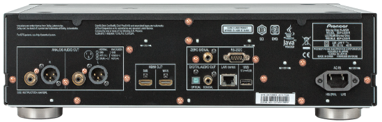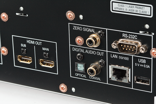 Wyjścia analogowe są zarówno w standardzie RCA, jak i XLR; te drugie mają swoje ustawienie w menu, związane z wyborem polaryzacji. Urządzenie ma dwa wyjścia HDMI – "main" i "sub" - a menu pozwala na przesyłanie nimi różnych sygnałów.