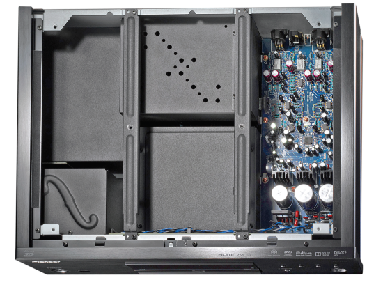 Wnętrze obudowy Pioneera jest podzielone na trzy sekcje. Większość bloków znajduje się pod metalowymi ekranami. W środkowej części, nad puszką transportu, ulokowano sekcję cyfrowych procesorów. Lewy segment zajmuje zasilacz. Puszka bliżej przedniego panelu kryje transformator, w drugiej są pozostałe elementy zasilacza. Blok audio jest po prawej stronie napędu, tylko dla tej płytki nie zastosowano ekranu.