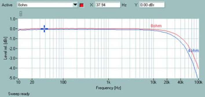 Pasmo przenoszenia (rys. 1) pokazuje wyborne zachowanie na basie, przy granicznych 10Hz spadek wynosi tylko -0,1dB, powyżej 15 kHz poziom opada już szybciej, wraz z 8 omami -3 dB pojawia się przy 80 kHz, dla 4 omów jest to 66 kHz.