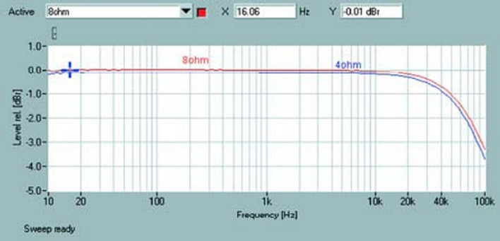 Pasmo przenoszenia (rys.1) pozwala podziwiać liniowość urządzenia w zakresie basu. Niezależnie od obciążenia przebieg charakterystyk jest idealny, a poziom przy 10Hz równy wyjściowemu 0dB. W zakresie tonów wysokich spadek rozpoczyna się od 20kHz, ale punkt -3dB możemy wyznaczyć dopiero na 92kHz dla 8Ω i 82kHz dla 4Ω.