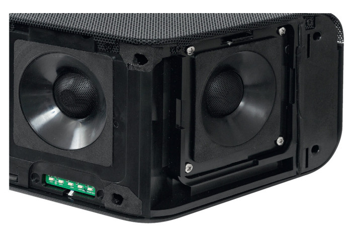 Zestaw przetworników (głośników) jest dość rozbudowany, ale widywaliśmy już większe rozpasanie, sama liczba też niczego nie przesądza. A w tym przypadku nie zapowiada takich rewelacji brzmieniowych, jakie na nas czekają. Przez założoną maskownicę odznaczają się okręgi przetworników, na froncie widać ich dziewięć, na skosach - po jednym, jeszcze jedna para znajduje się na górnej powierzchni, też na skrajach. Zastosowano w sumie 13 przetworników trzech typów: nisko- -średniotonowe (sześć na froncie), wysokotonowe (trzy na froncie, dwa na skosach) i szerokopasmowe (dwa na górze).
