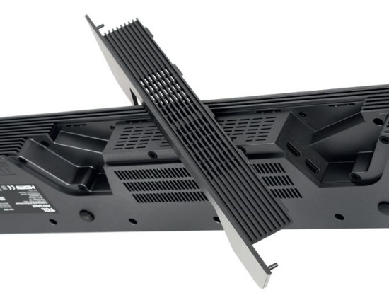 Głośniki soundbara TCL TS9030 TS9030 RAY-DANZ są przesunięte do środka i skręcone na boki w taki sposób, by promieniowały przez akustyczną soczewkę (po jednej na stronę), która koncentruje wiązkę i kieruje ją na boki. Dźwięk kształtują też procesory, co pozwoli na przyszłe udoskonalenia oprogramowania.