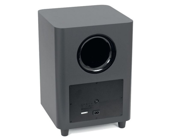 Bezprzewodowy subwoofer jest bardzo duży (jak na element systemu soundbarowego), stoi na wysokich nóżkach, bowiem aż 25-cm głośnik umieszczono na dolnej ściance, a z tyłu wyprowadzono imponujący tunel bas-refleks.