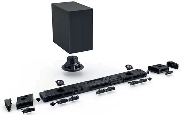 Kanał centralny ma już konfigurację jednodrożną, ale z dwoma takimi "owalami", a brak wysokotonowego można wybaczyć wobec jego dialogowego przeznaczenia. Za to kolejne wysokotonowe pojawiają się na skrajach listwy, skręcone na zewnątrz, aby wywołać jak najwięcej odbić od bocznych ścian pomieszczenia – to przetworniki efektowe warstwy dolnej.