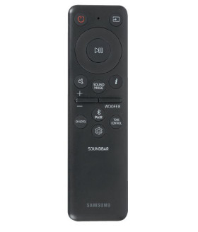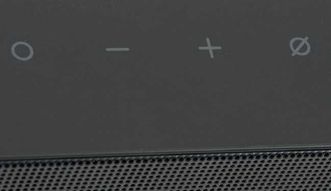 Umieszczony pod dużym ekranem wygląda szałowo - filigranowo. Wykonany jest starannie, delikatność podkreślają zaokrąglenia, środkową część górnej zajmuje panel podstawowych przycisków sterujących (regulacja głośności, wybór źródeł i wyciszenie mikrofonu asystenta głosowego). Nie ma wyświetlacza (tak jak w wielu soundbarach Samsunga), tylko niewielki panel z diodami LED.