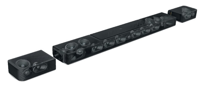W centrum znajduje się 20-mm kopułka wysokotonowa, po jej bokach są po trzy owalne (tzw. Racetrack) głośniki nisko-średniotonowe. Tuż przy bocznych krawędziach JBL-a Bar 1300 znajdują się dwie kolejne jednostki wysokotonowe, skręcone delikatnie na zewnątrz, a na bocznych ściankach – następne dwie.