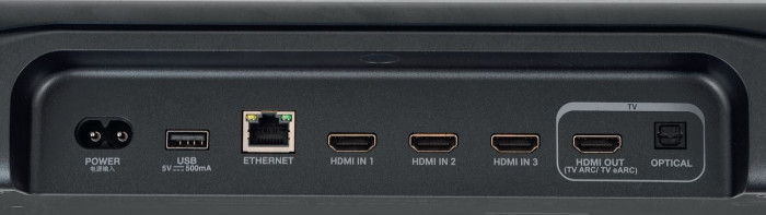 JBL Bar 1300 został wyposażony też w trzy wejścia HDMI (wszystkie obsługują standard 4K). Na wszelki wypadek zainstalowano też wejście optyczne. Jest złącze LAN, a USB służy do celów serwisowych.