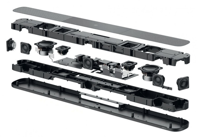 O dźwięk przestrzenny, oparty na założeniach wirtualnych, dba fantastyczny system Ambeo. Układ głośnikowy listwy jest najbliższy konfiguracji 5.1.2 (jeszcze bez subwoofera Sub), chociaż sam Sennheiser przedstawia go jako 7.1.4, co prawdopodobnie jest związane z finalnymi możliwościami dźwięku wirtualnego.