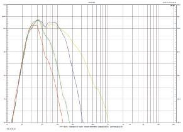 Charakterystyka pośrednia (zielona), ze spadkiem -6 dB przy ok. 60 Hz, pojawia się przy ustawieniu na "godzinie dwunastej", a zielonożółta - po przełączeniu w tryb LFE; wtedy teoretycznie filtrowanie w ogóle powinno zostać wyłączone, w praktyce zostaje przesunięte nieco wyżej (-6 dB przy 160 Hz), przede wszystkim zbocze ma mniejsze nachylenie.