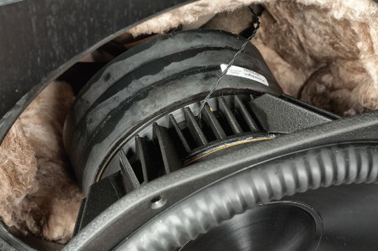 Udało się wykręcić głośnik, ale wyjąć - już nie; trzyma się na krótkich kablach. Można było jednak zobaczyć układ magnetyczny o średnicy 22 cm, złożony z trzech pierścieni ferrytowych o łącznej grubości 8 cm.