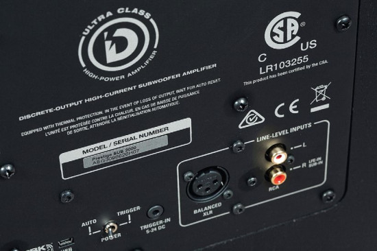 Zestaw wejść ograniczono do standardów, które w takim subwooferze są rzeczywiście potrzebne. Zrezygnowano z wejść na zaciskach głośnikowych, zostawiając klasyczną parkę RCA i dodając do niej pojedyncze wejście XLR dla sygnału LFE (ale sygnał LFE możemy też dostarczyć do jednego z gniazd RCA). Wzmacniacz nie ma mechanicznego włącznika zasilania - obudzi go albo dochodzący sygnał audio (tryb auto), albo trigger.