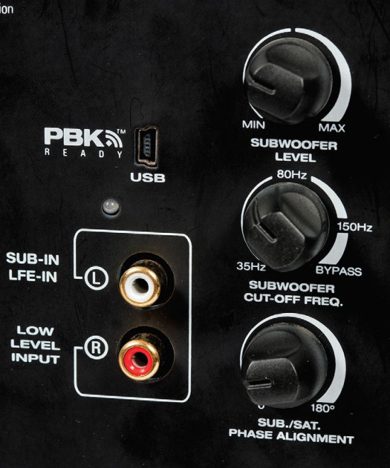 Standardowe wejścia obejmują tylko parę gniazd RC, za pomocą których subwoofer przyjmie albo sygnał stereofoniczny, albo LFE, a trzy podobne pokrętła pozwalają na klasyczną regulację poziomu, częstotliwości granicznej i fazy. Automatyczny układ zabezpieczeń chroni przed przesterowaniem (soft clipping) i przekroczeniem krytycznej temperatury.