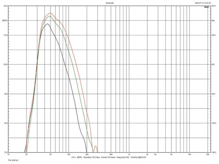 Bas-refleks dostrojono wysoko – do 45 Hz, dodając ostre filtrowanie górnoprzepustowe już poniżej 35 Hz, stąd w oktawie 20 Hz – 40 Hz spadek wynosi ponad 45 dB.
