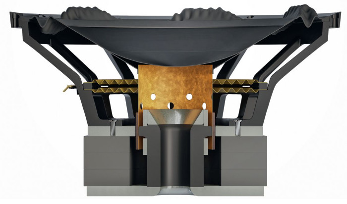 Jeżeli natomiast "napęd" jest solidny, wówczas nawet ciężka membrana nie jest problemem (jej określona masa jest potrzebna do ustalenia niskiej częstotliwości rezonansowej, niezależnie od zapewnienia odpowiedniej sztywności, która z grubością, a więc z masą, też ma związek). Tym fundamentem jest zestaw trzech pierścieni ferrytowych o średnicy 200 mm i łącznej grubości 60 mm.